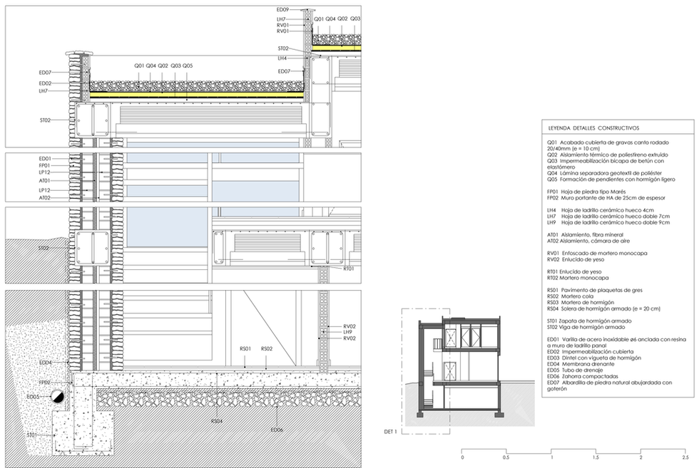 En función del proyecto en el que nos encontremos puede que exista un documento que recoja el nivel mínimo de definición de documentación y/o geometría, pero si es uno mismo quién decide (o los requisitos lo permiten), un recurso muy práctico para no modelar todos los elementos que componen la edificación y permitir así, por ejemplo, agilidad a la hora de rotar, es el empleo de #familias 2D en las vistas necesarias, obteniendo detalles constructivos como estos: